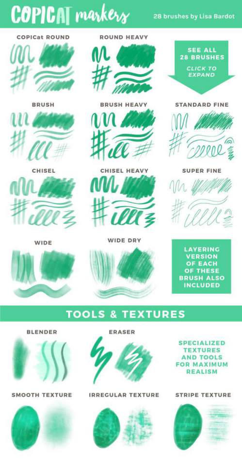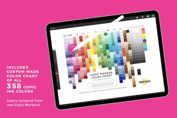Procreate油性马克笔笔刷和Procreate色卡,共有28个笔刷和358种颜色。笔刷包含了:10个常规笔刷(带有6种