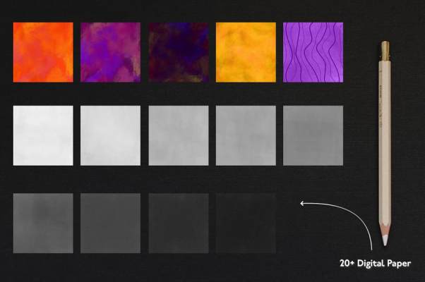 2张特别的纹理背景图(2500x2500px,600dpi,PNG);万圣节主题笔刷包括:35种水彩笔刷、7种万圣纹理笔刷、