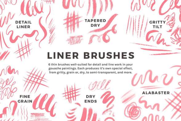 水粉颜料画笔有三种效果:淡色画笔、多点画笔、鲜艳画笔。笔刷还有干画笔效果。基本涵盖了所有的水粉颜料画笔效果。