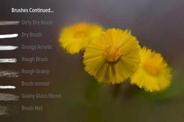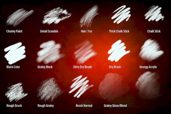 15个笔刷分别为:普通刷,大块油漆,细碎屑,毛发和毛皮,粗粉笔棒,粉笔棒,块状颜色,粒状块,脏块状笔刷,
