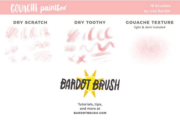 污渍笔刷、干性划痕笔刷、干性锯齿笔刷、水粉纹理笔刷(亮色、暗色)等。笔刷适用于绘制艺术插画、艺术字等。