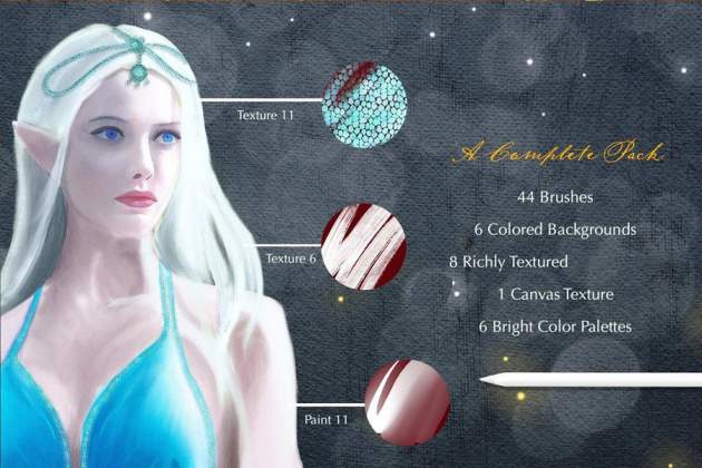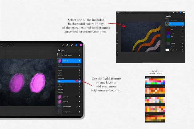 彩色背景,外加额外的 8 种纹理丰富的背景和 6 种调色板,所有这些都为您的艺术增添了魔力。