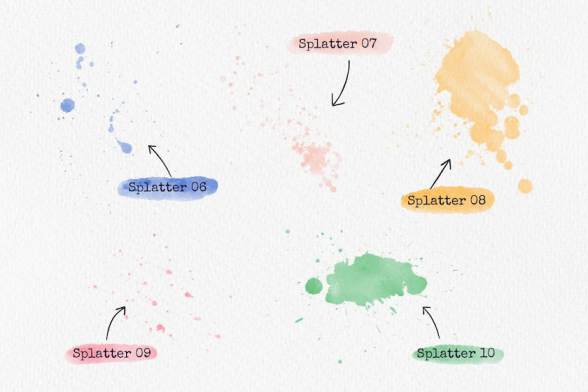 飞溅和斑点印章的Procreate水彩笔刷素材,素材包附带总共15种不同的水彩印章:10个飞溅印章笔刷和5个斑点