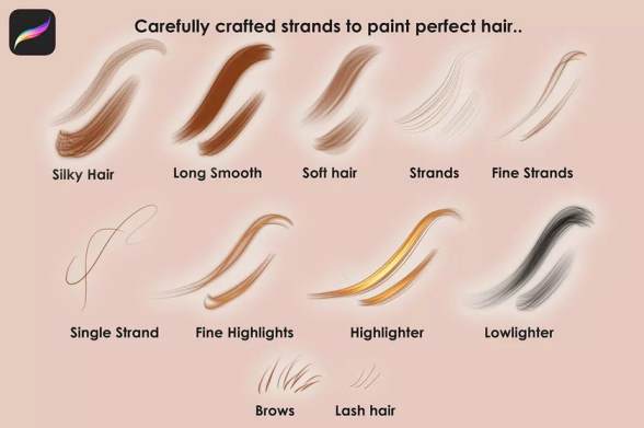 逼真的头发和身体毛发Procreate笔刷素材,总共有20个笔刷,包含了高光头发笔刷、普通头发笔刷、眉毛笔刷、