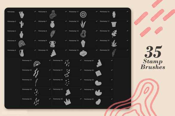 创意的花瓶树叶等几何装饰性插画设计Procreate笔刷素材,素材一共有35个图案印章笔刷,其中包含了许多