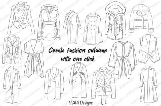 一组服装设计必备的时尚外套线框图Procreate笔刷素材,总共有35个Procreate图案笔刷,包含有外套、