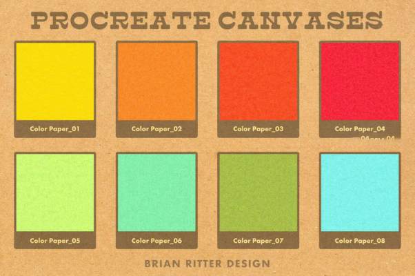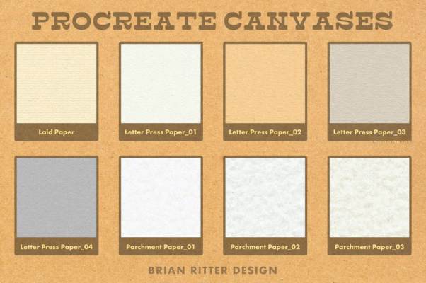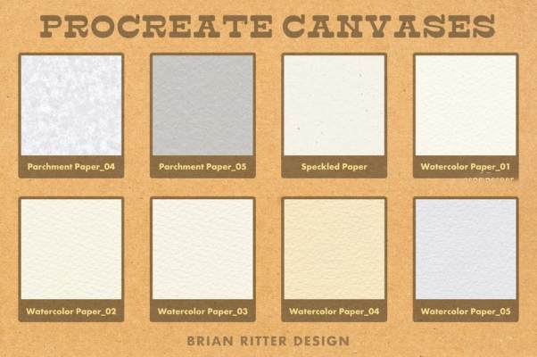 一个画笔组;40 幅 Procreate 画布,包括彩色纸、牛皮纸、平纹纸、凸版纸、羊皮纸、斑点纸和水彩纸。
