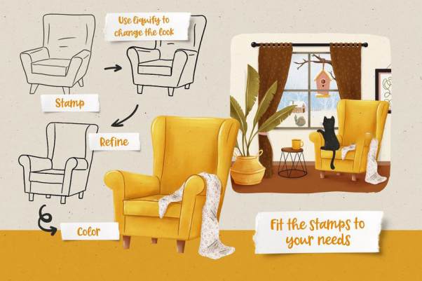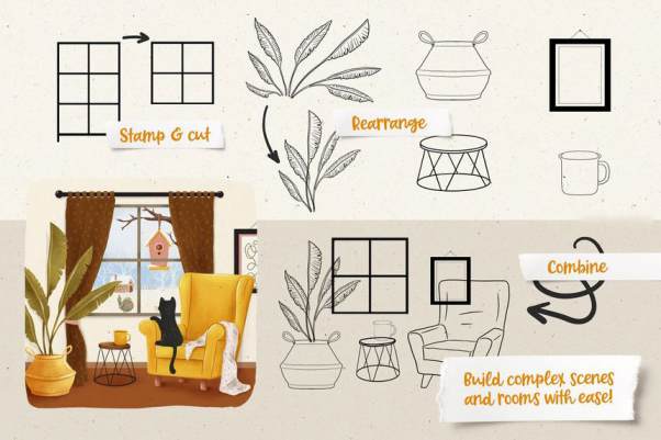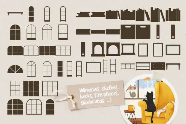 室内软装设计的Procreate图案笔刷素材,包含了 窗户、书架、书籍、植物、扶手椅、家具和其他配件等的