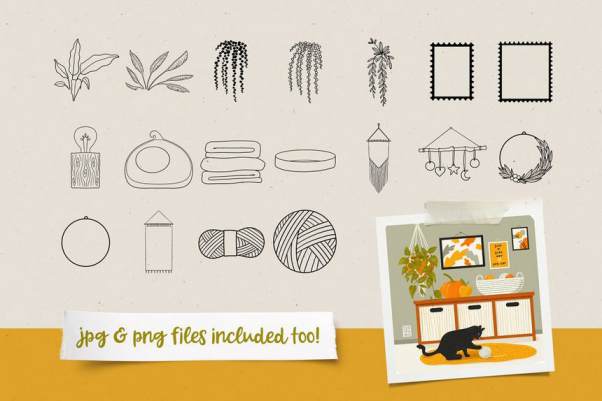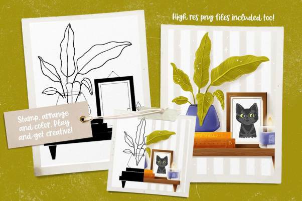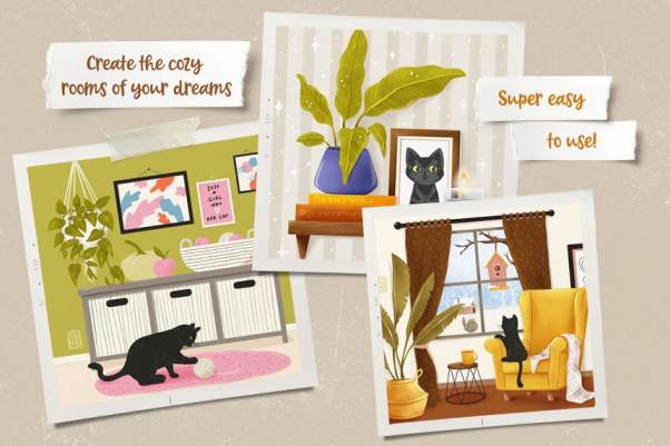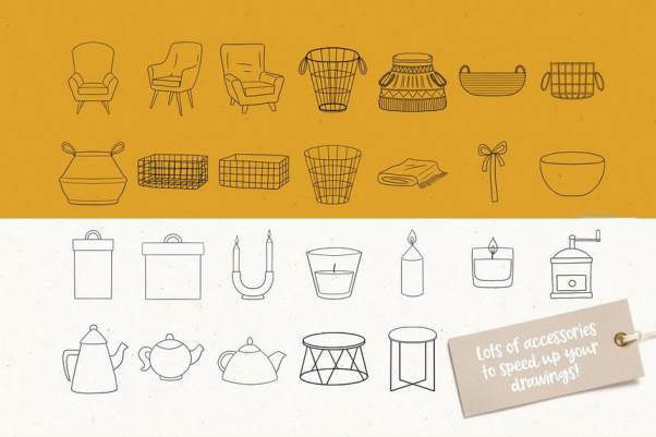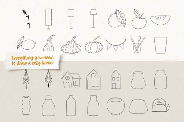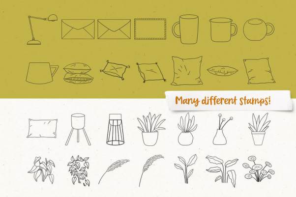 156 种精美手绘图案笔刷,可帮助您绘制梦想中的房间。另外素材还提供155 个 PNG 格式的元素,具有