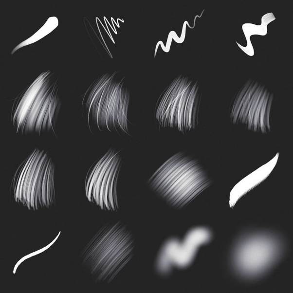 基础笔刷、细节笔刷、高亮笔刷、凌乱飘逸头发笔刷、毛茸茸笔刷、鬓发笔刷、浓密头发笔刷、杂散头发笔刷、