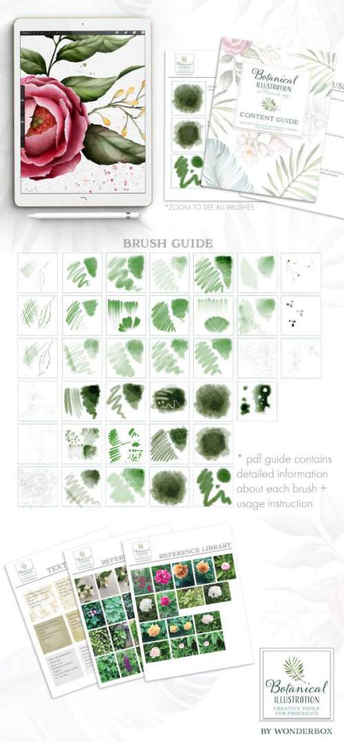 6套procreate色卡,5个带有预设纹理的画布模板,8种纹理,48张植物参考照片,2个已绘好插图的Procreate文件。