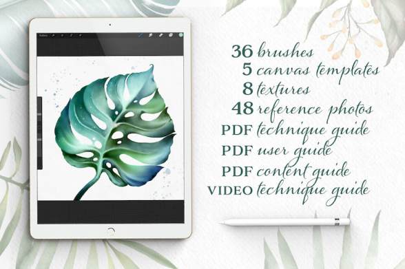 适合用于植物花卉插画绘画的Procreate水彩笔刷素材,该套笔刷素材包含了36个画笔(水彩,墨水,铅笔,特殊效果),