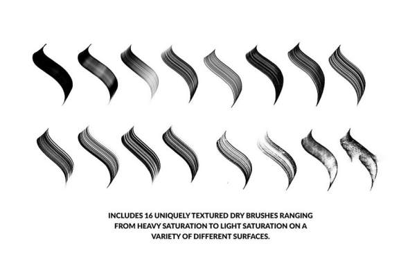 16 种独特纹理的干刷,在各种不同的表面上从重饱和到轻饱和。这些画笔也是高度可定制的。