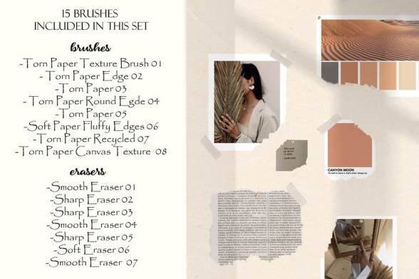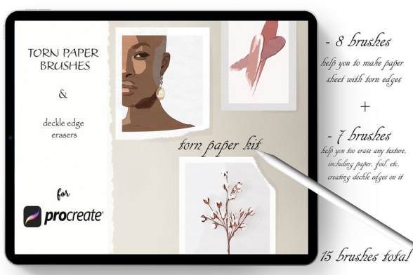 纸质撕破边缘效果的Procreate笔刷素材,总共有15个笔刷,其中8个为边缘撕裂的纸张纹理笔刷,7个为边缘撕裂