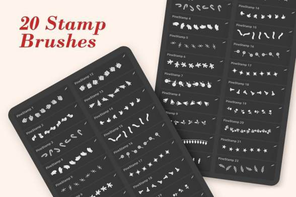 温暖可爱的圣诞主题装饰性设计Procreate插画笔刷素材,其中一共有20个印章笔刷和20多种圣诞主题的插画笔刷素材,