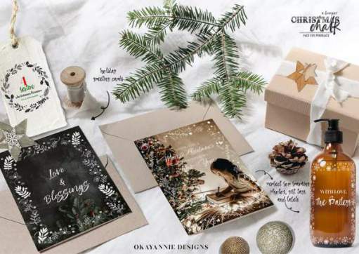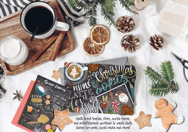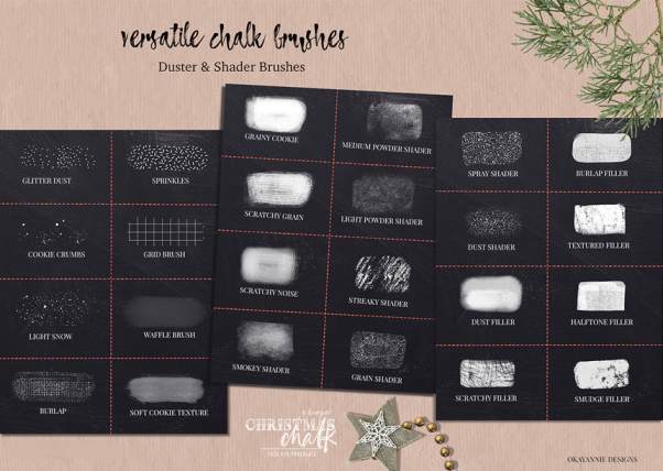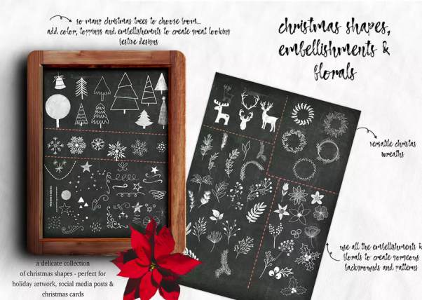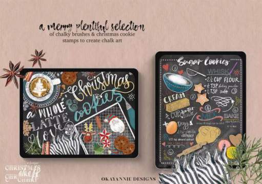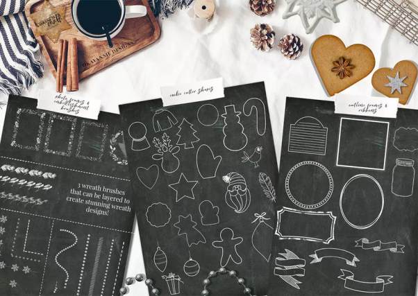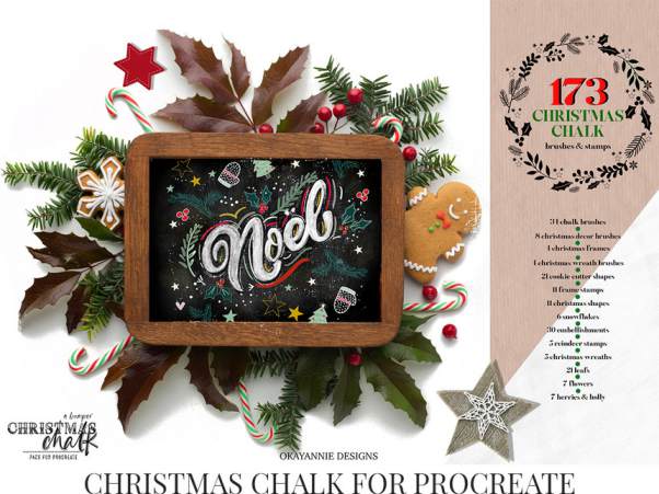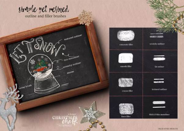 填充,着色和添加纹理。素材包含34支粉笔字笔刷、8个圣诞装饰笔刷、4个圣诞节框架笔刷、4个圣诞花环笔刷、