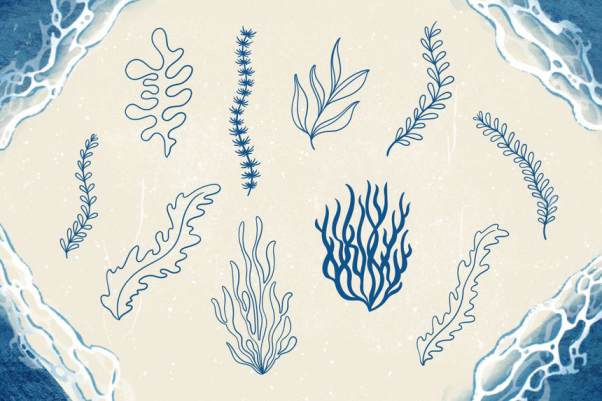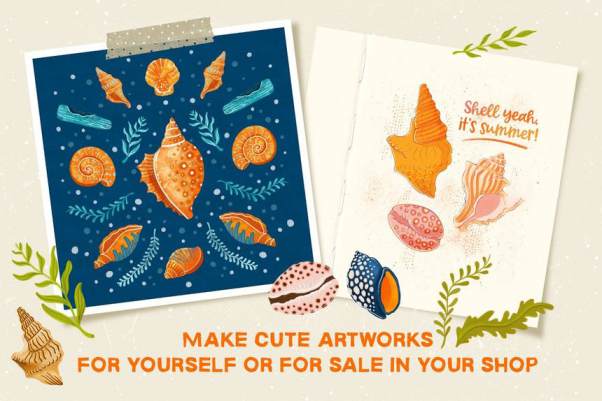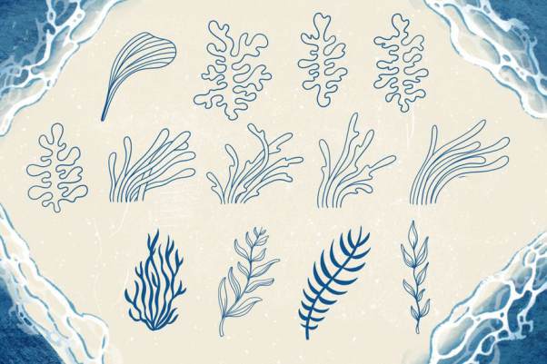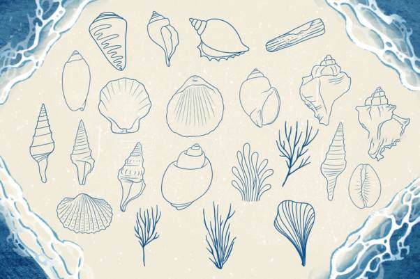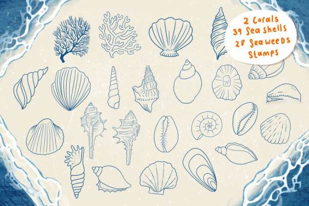 贝壳海藻珊瑚线稿图案笔刷和纹理笔刷的Procreate素材,包含了 74 种精美的贝壳、海藻、珊瑚和水岸线