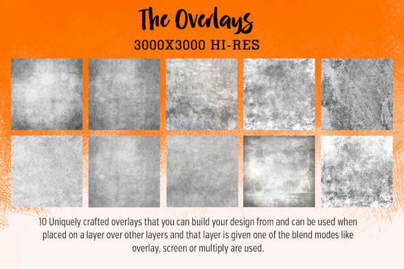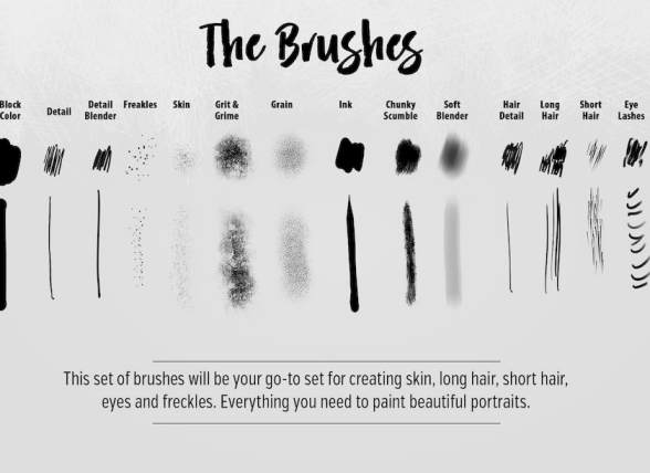 覆盖图层和5个纹理图形,帮助修饰您的肖像作品。笔刷包含以下几种画笔:色块,细节修饰,雀斑,污渍,头发