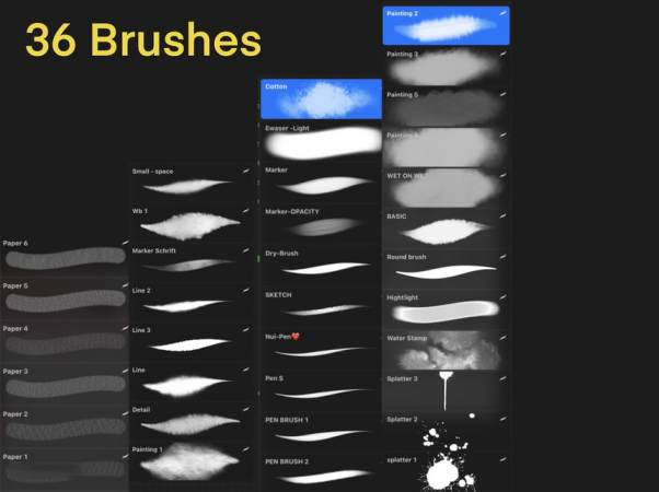 水彩艺术绘画效果procreate笔刷素材,总共有36个具有不同粗细、纹理变化的笔刷,包含有纸张纹理笔刷、
