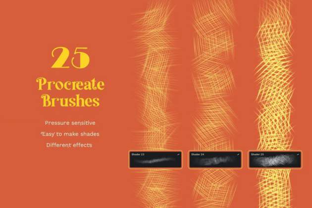 素材包含25个笔刷,仅适用于procreate软件。素材带有压感设计,流畅的线条和噪点设计,用在您的插画