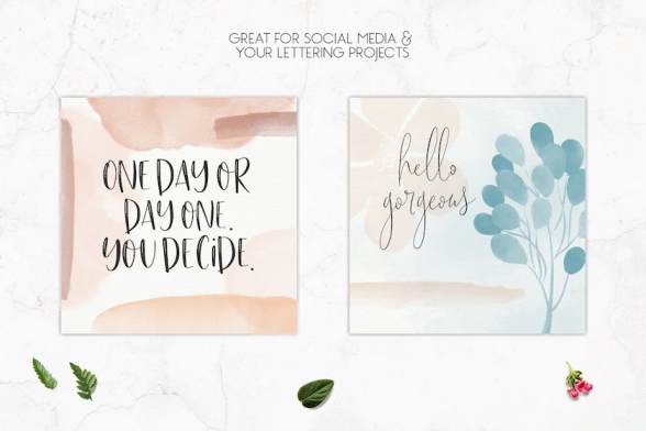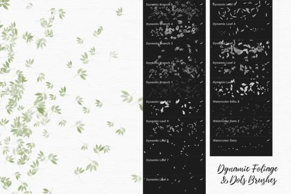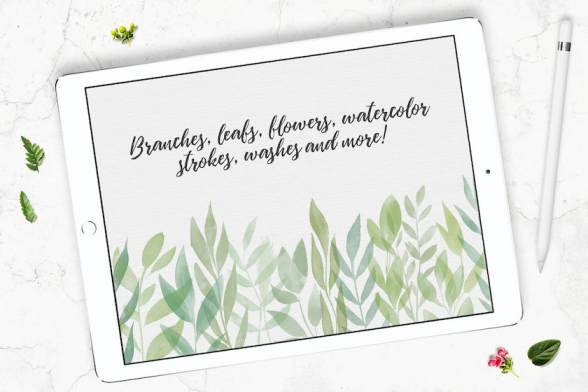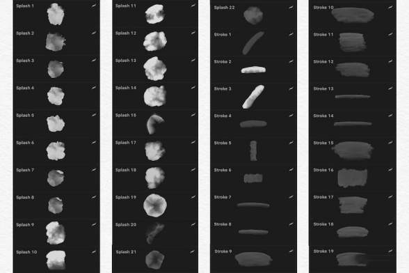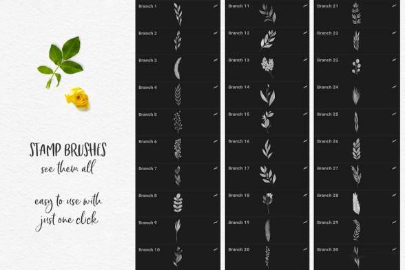 22个水彩色块笔刷,23个轻触水彩笔刷,6个圆形印章笔刷,13个连贯的树叶笔刷,3个连贯的散点笔刷,12个连续的