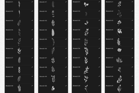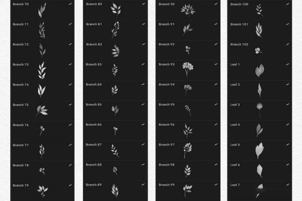 244个笔刷的procreate水彩印章笔刷素材,其中包含有102个树枝印章笔刷,38个叶子印章笔刷,25个花朵印章笔刷,