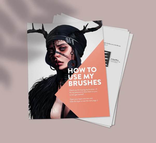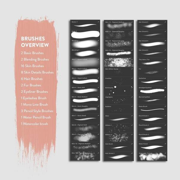 9个纹理皮肤笔刷、4个皮肤细节笔刷、4个发光细节笔刷、8个头发毛皮笔刷、3个睫毛和眼线笔刷、1个线条笔刷