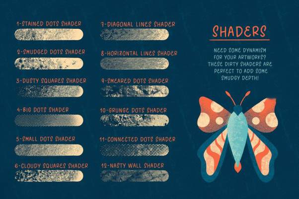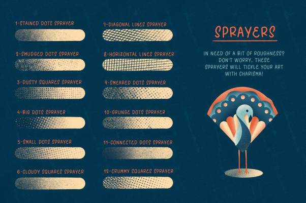 素材内包含有42 个半色调笔刷——14 个着色画笔、14 个纹理画笔、14 个喷雾画笔。另外还额外附带