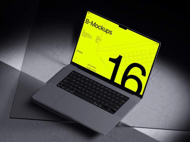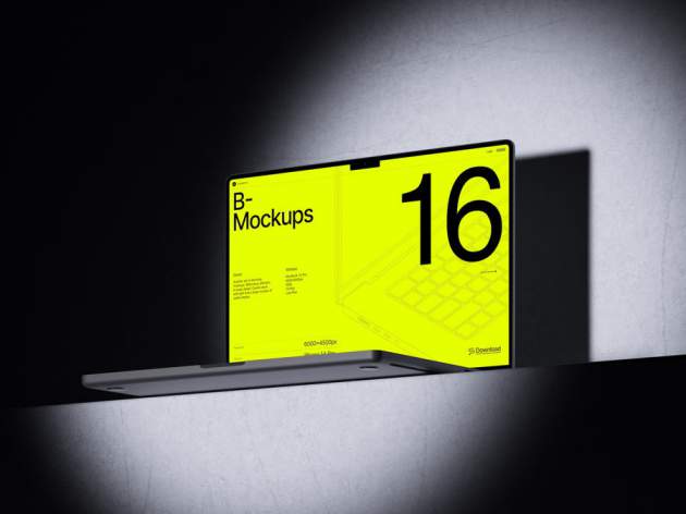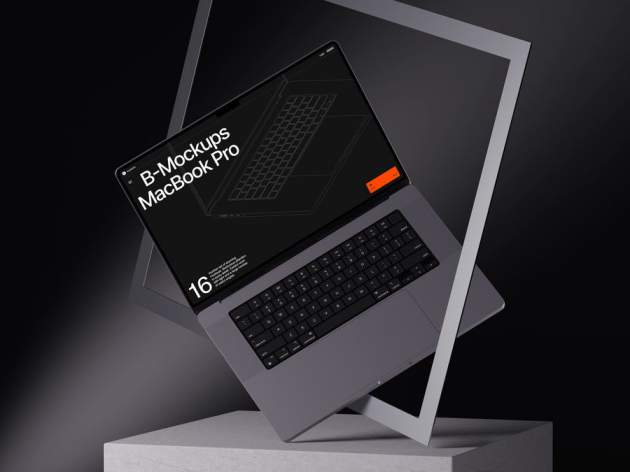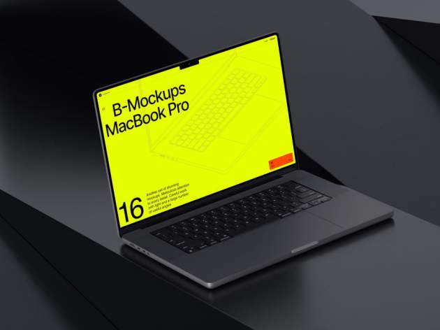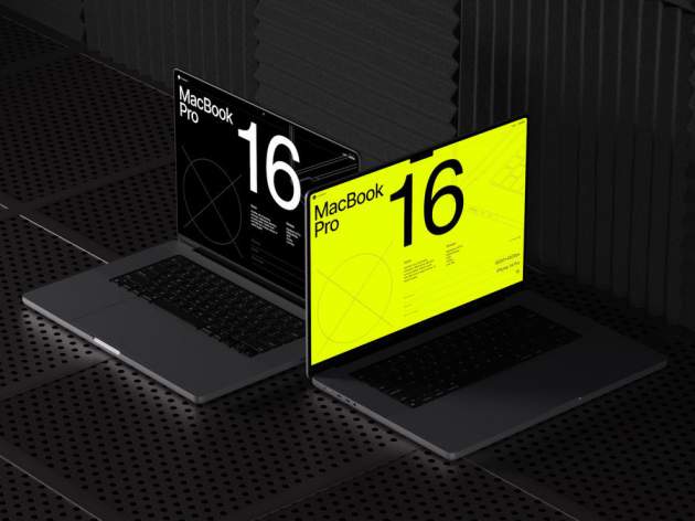 苹果笔记本平板电脑样机PSD模板,总共有16个不同场景的苹果MacBook 16 Pro笔记本电脑样机,
