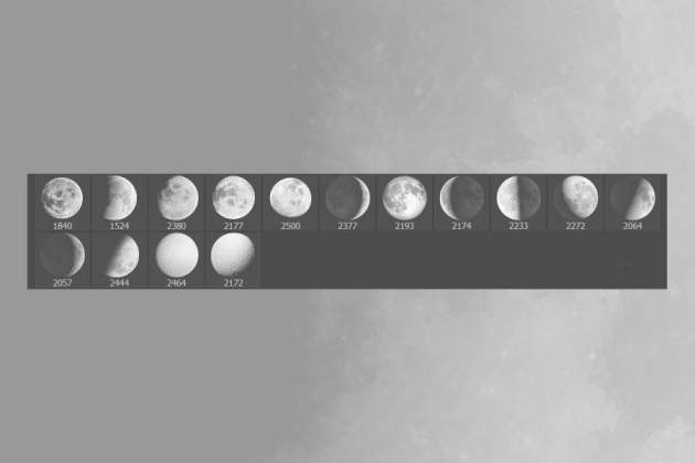 月球月亮多面阴阳变化设计展示的笔刷素材,包含15个设计元素,尺寸为2500px。提供abr文件,