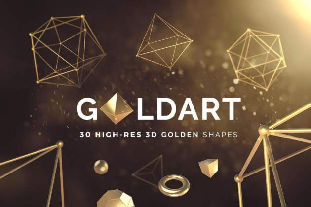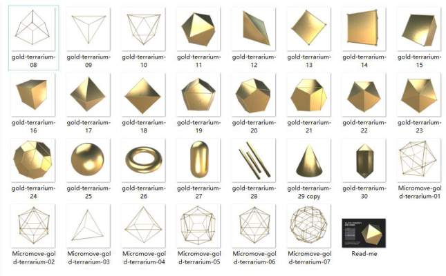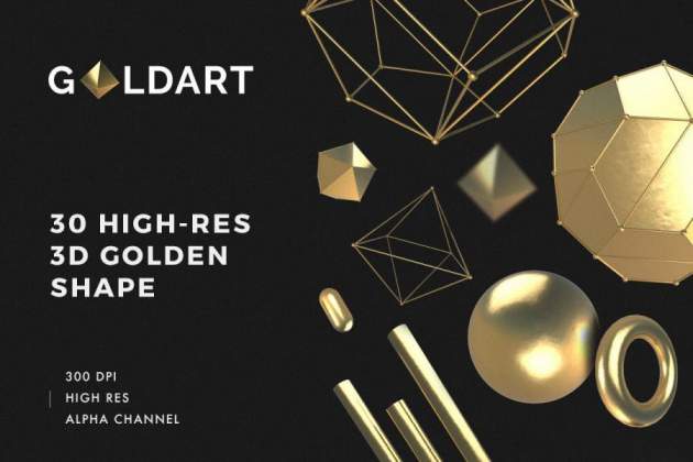 30款金色3D立体几何图形元素平面PNG素材,总共有30个不同形状的高分辨率图形,包括球体、