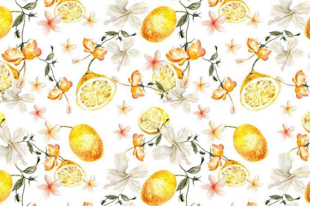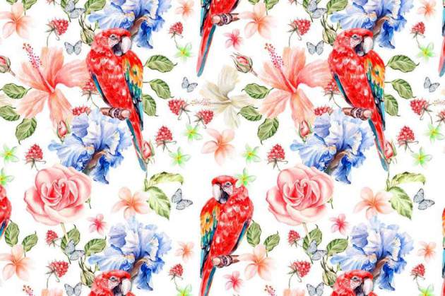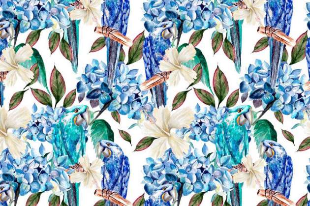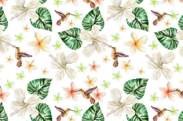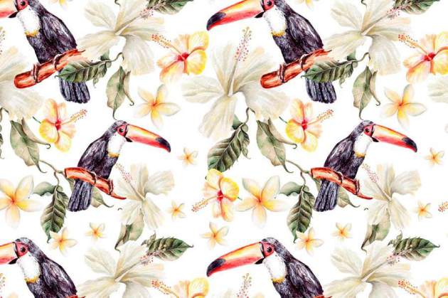 大嘴鸟、蜂鸟、鹦鹉、柠檬、树叶等花卉果蔬鸟类设计。素材还额外提供了五个无缝插画素材。