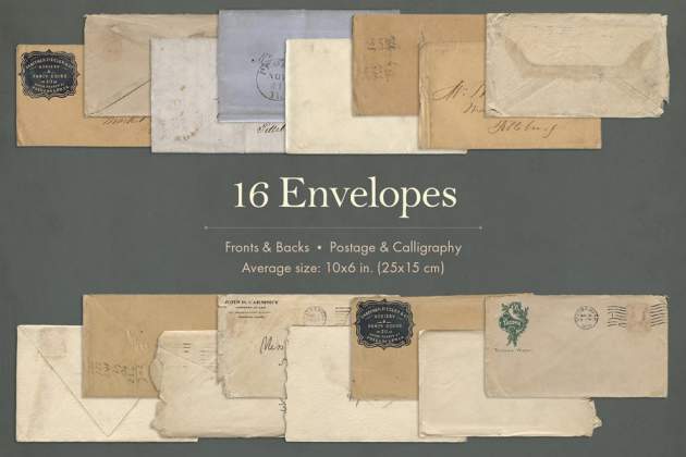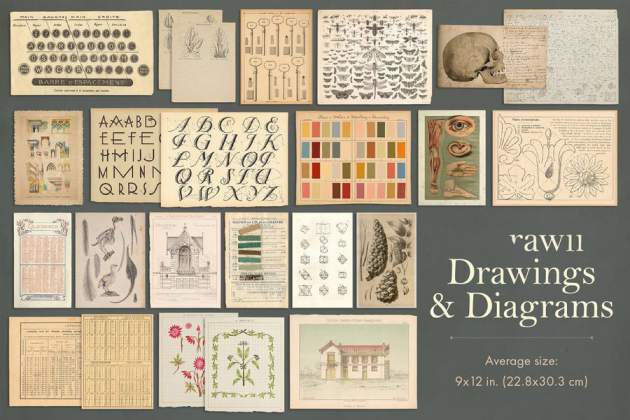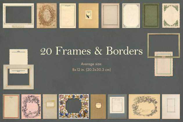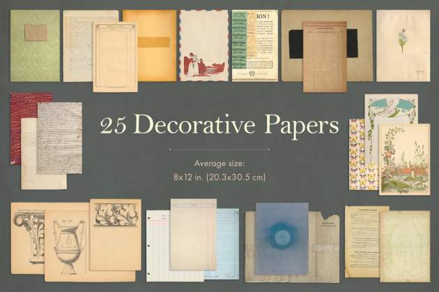 25张装饰纸,16 个信封(正面和背面),24 幅图纸和图表,20 个框架和边框,30 张卡片和标签,