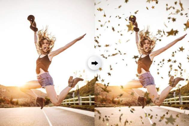 金色纸屑散落纷飞效果叠加覆盖背景素材,总共有6种不同的纸屑样式,包括五角星、丝带等,部分还带有模糊效果,