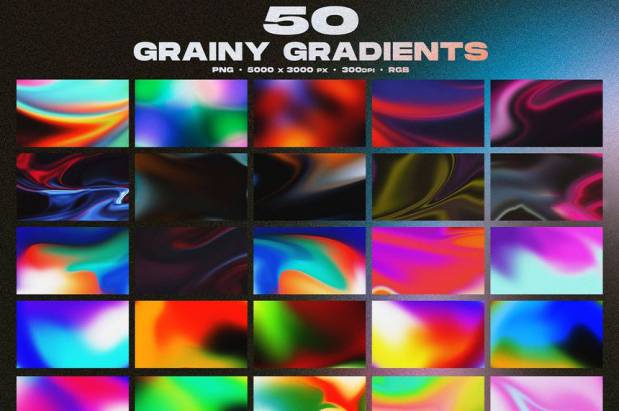 50种不同的渐变色粗糙粒状感纹理背景图片素材包,具有各种令人惊叹的渐变色和调色板。这套独特、