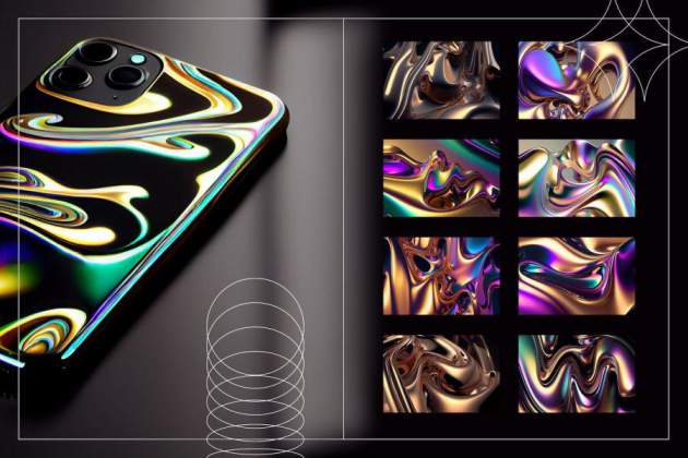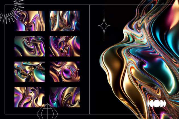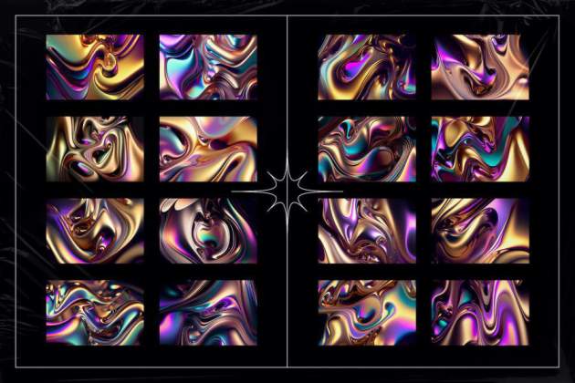彩虹色渐变流动液态金属效果背景图片素材,总共有40张图片,具有彩虹色或金属光泽的液态金属外观。