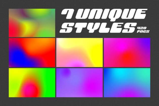 420款彩色渐变颗粒感纹理背景图素材。素材包含7种主题颜色,14种渐变样式的背景图设计,